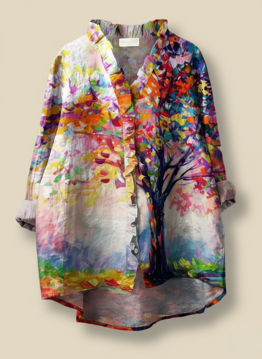 Women's Vintage Flower Tree Art Print Casual Cotton And Linen Ruffle Shirt