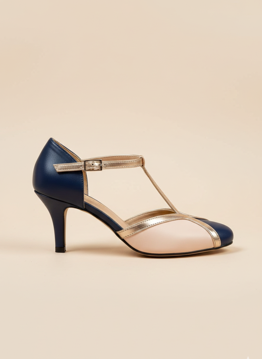 The Alessia heel is a graceful fusion of sophistication and standout design. With a striking navy-and-blush color block and a subtle golden T-strap, it offers a fresh twist on a classic silhouette. Whether you’re heading to an elegant dinner or adding polish to a casual outfit, Alessia is your go-to for timeless elegance with a hint of playfulness. Designed with a tapered heel, rounded toe, and smooth finishes, Alessia delivers both comfort and visual charm. The secure ankle strap keeps everything in place while elevating your entire look—day or night.