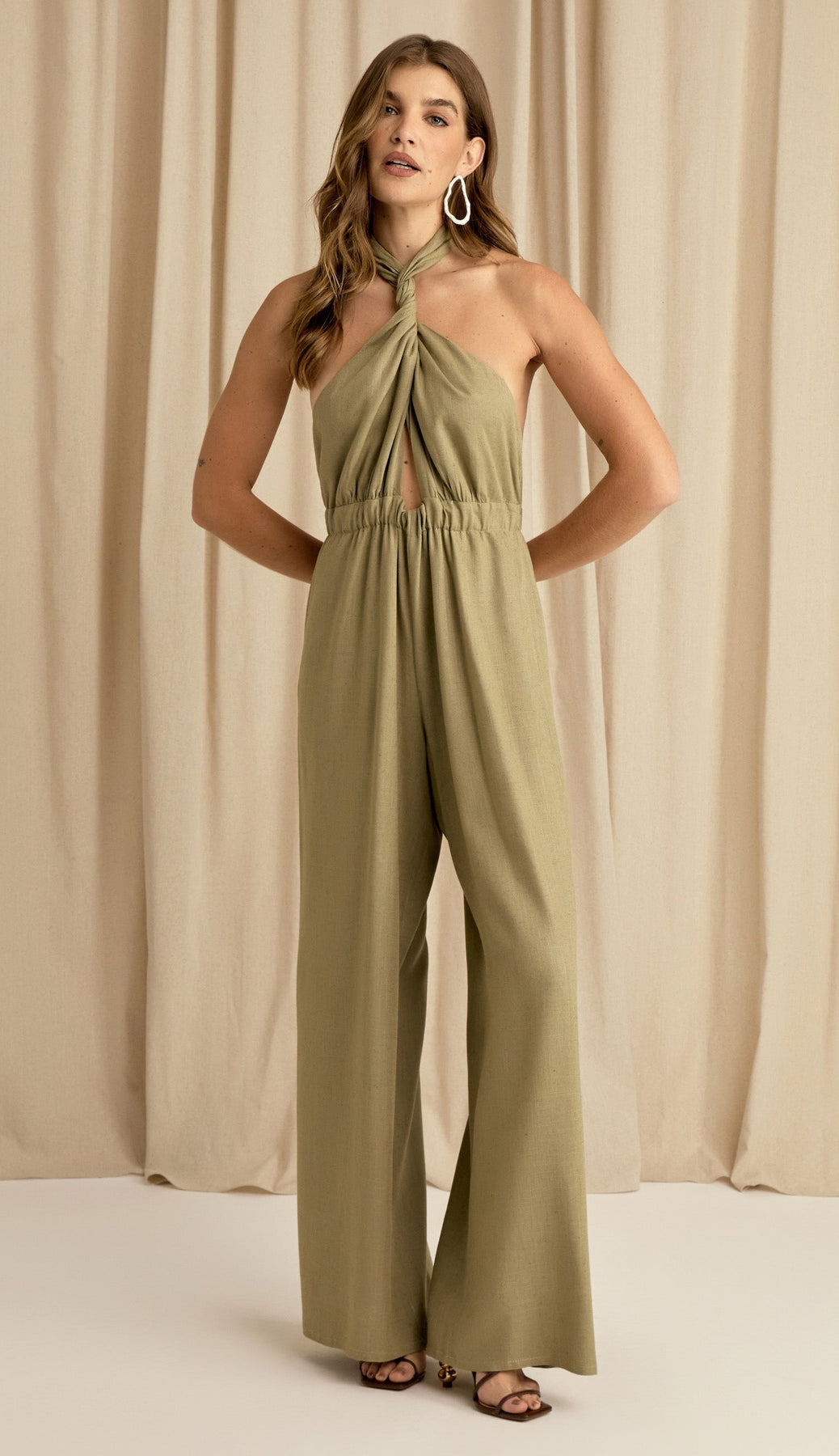 Macacão confeccionado em linho. Possui forro na parte de baixo, tecido duplo no busto para não ficar transparente, modelagem frente única com duas faixas fixas compridas que saem da cintura para amarrar e fechar o decote, permitindo diversos tipos de amarração diferentes; conta com elástico franzido na cintura e fechamento traseiro na calça por zíper invisível.