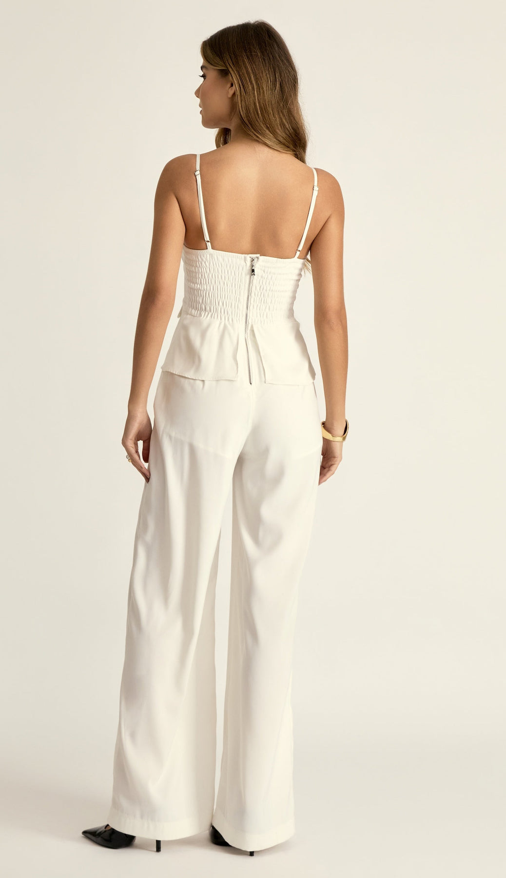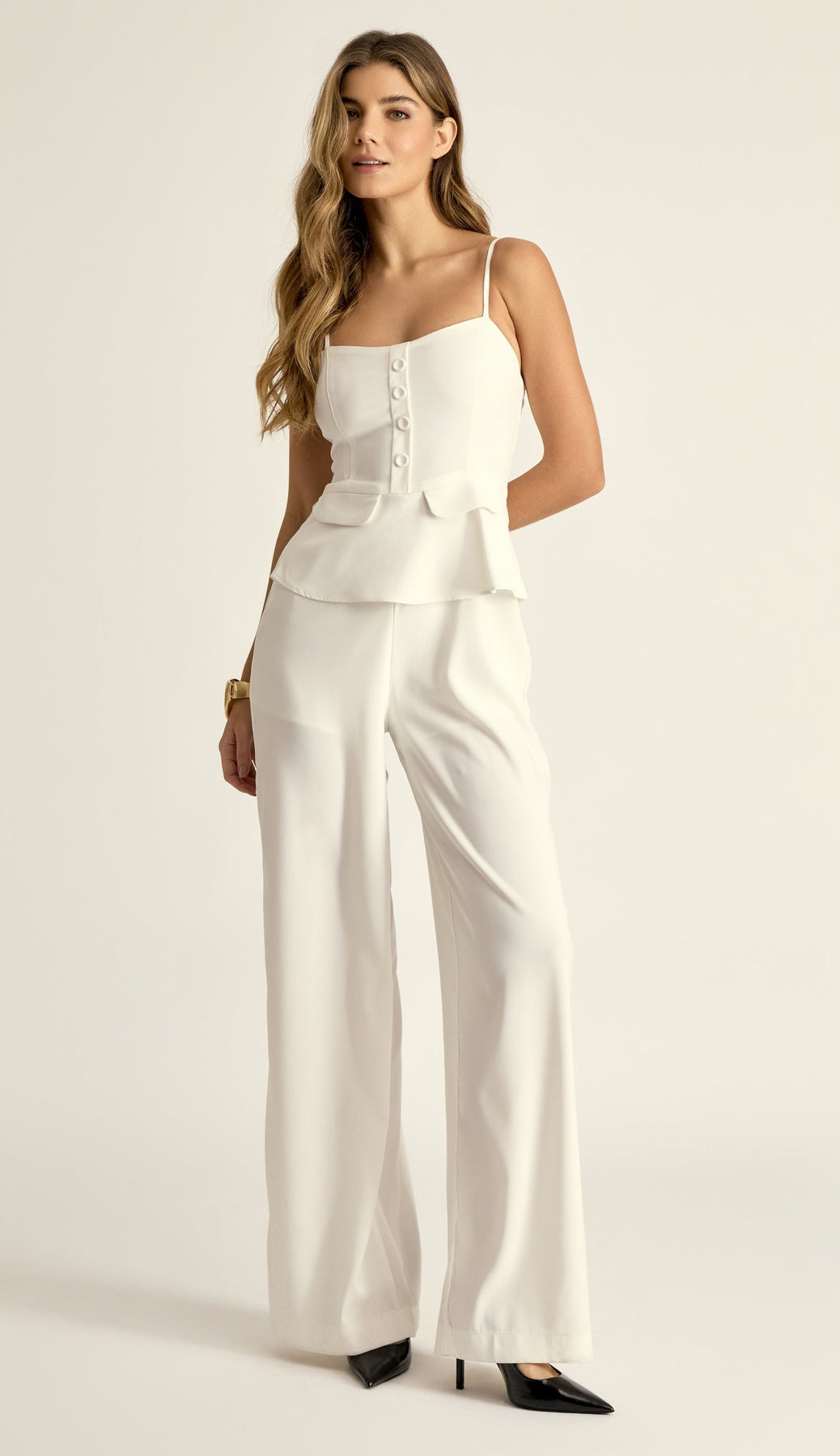 A jumpsuit crafted from satin-finish tailoring with full lining for comfort and refinement. It features a princess-style neckline with adjustable straps and sculpting cut lines that enhance the bust beautifully. The front is detailed with decorative covered buttons, adding a touch of classic elegance.
