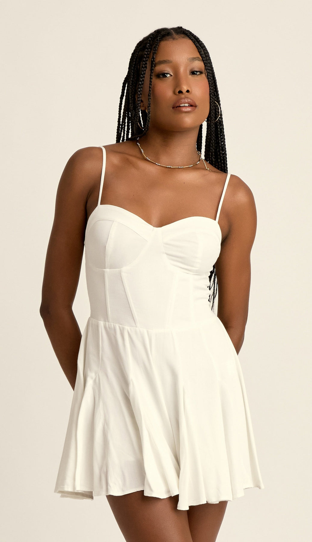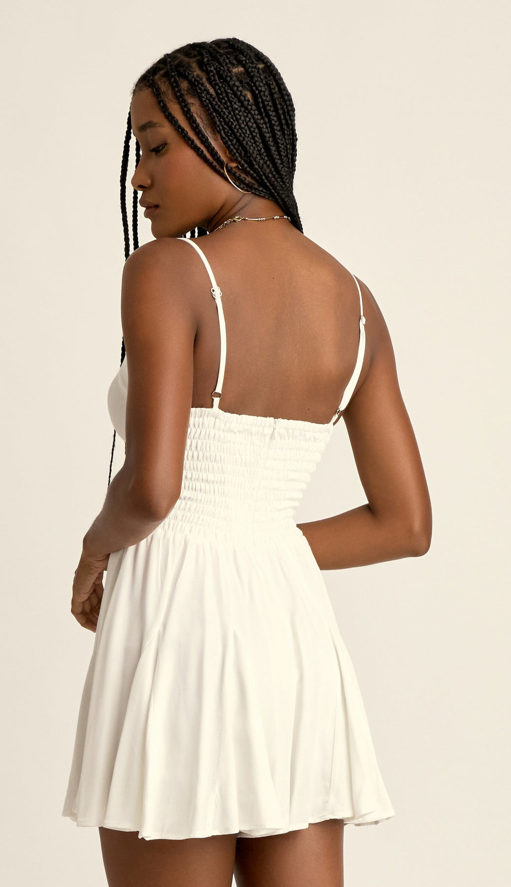 The back has a smocked section for added comfort and flexibility, paired with an invisible zipper for a clean finish. The design includes lined shorts underneath a flowy over-skirt with soft godets that create gorgeous movement with every step.
