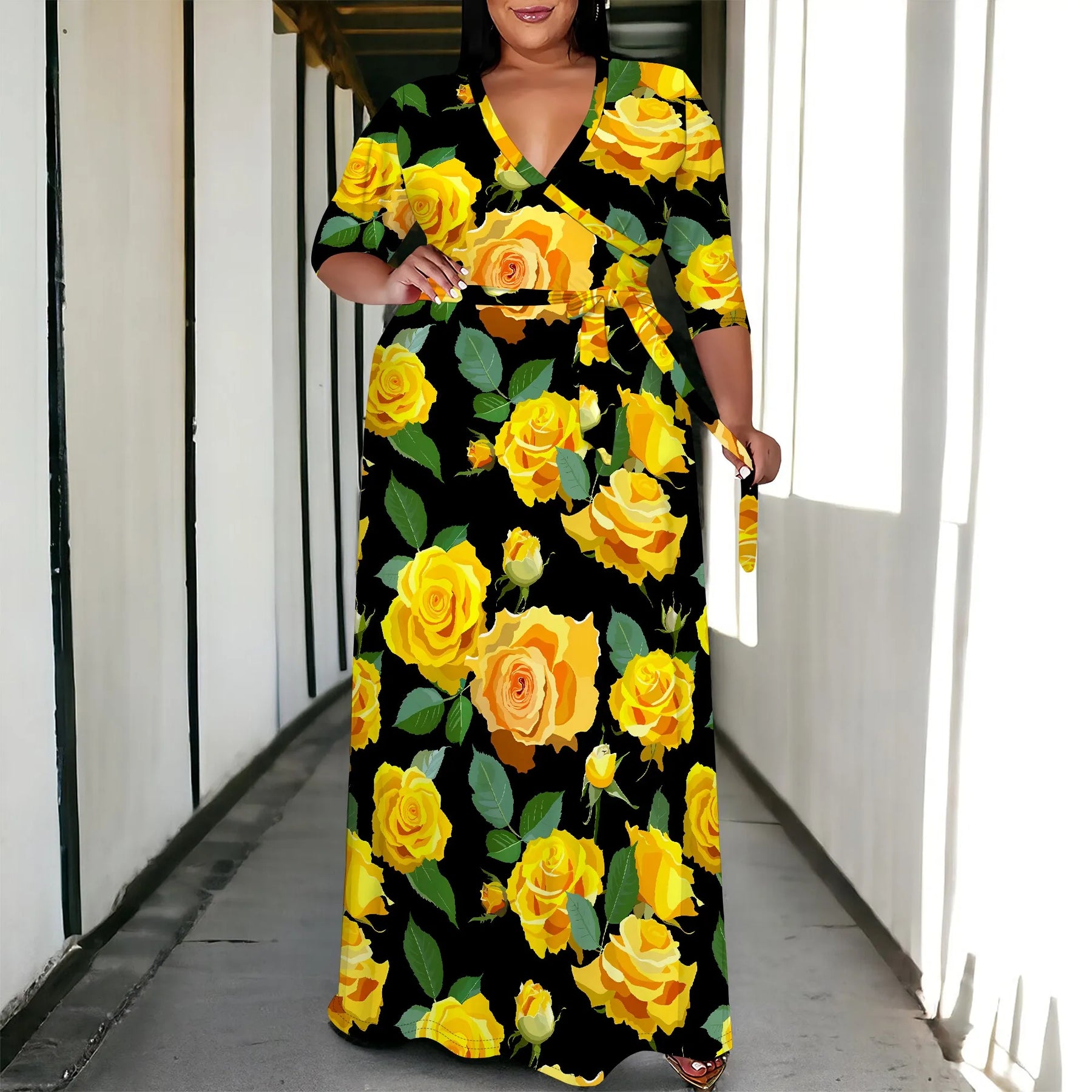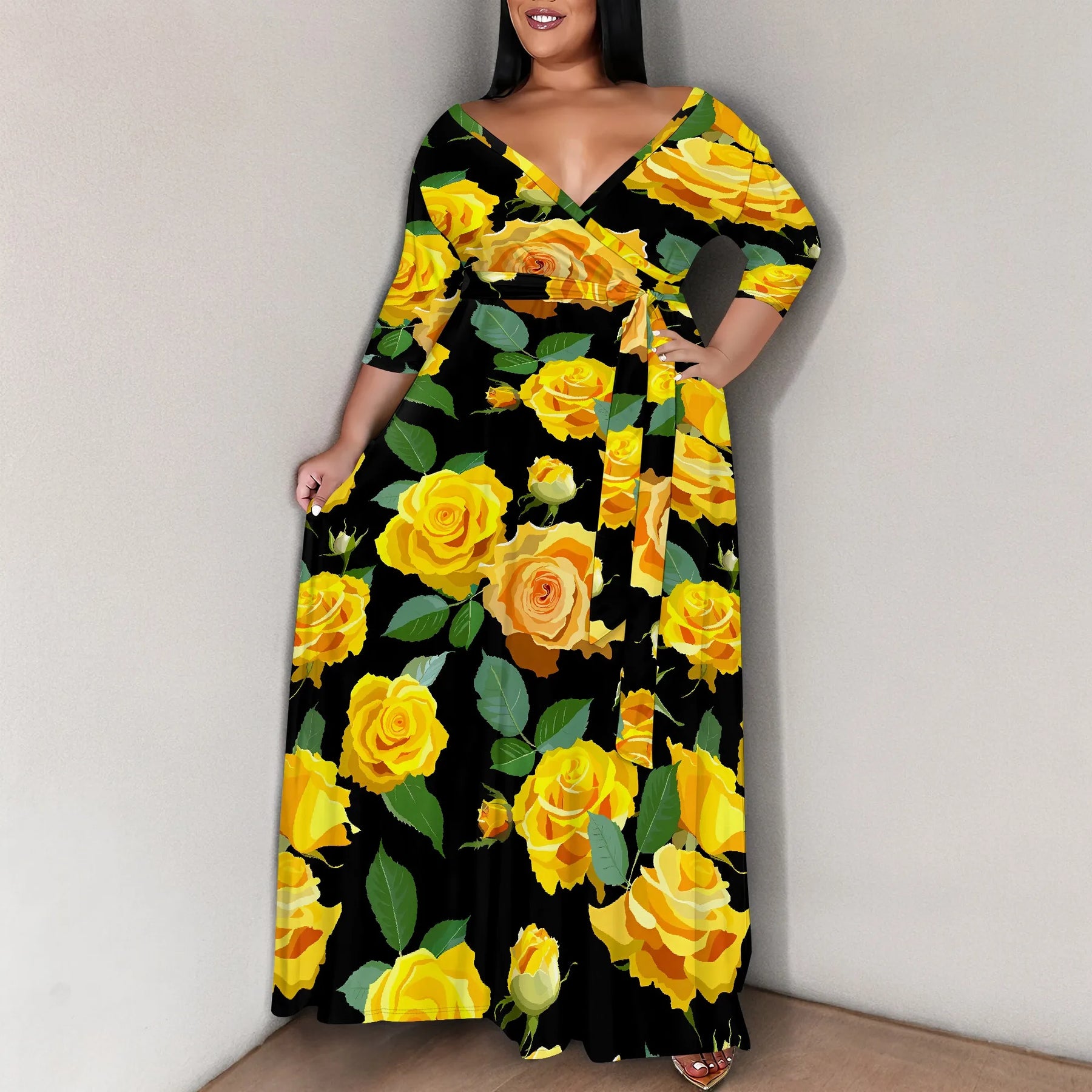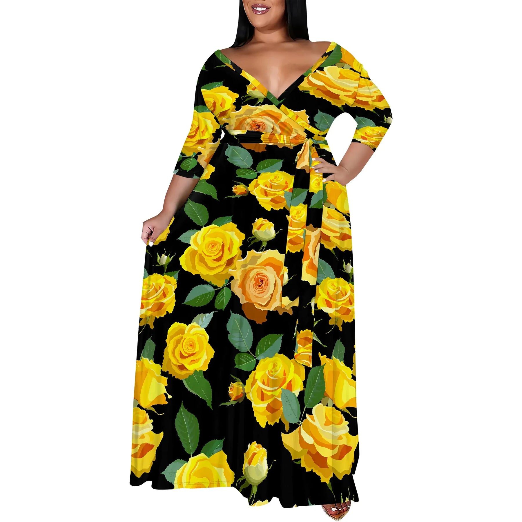Turn every room into your runway with this stunning Plus Size Floral Maxi Dress, featuring a rich black base adorned with bold yellow rose prints. Designed with a flattering wrap V-neckline, this dress brings elegance, femininity, and effortless charm to any occasion.