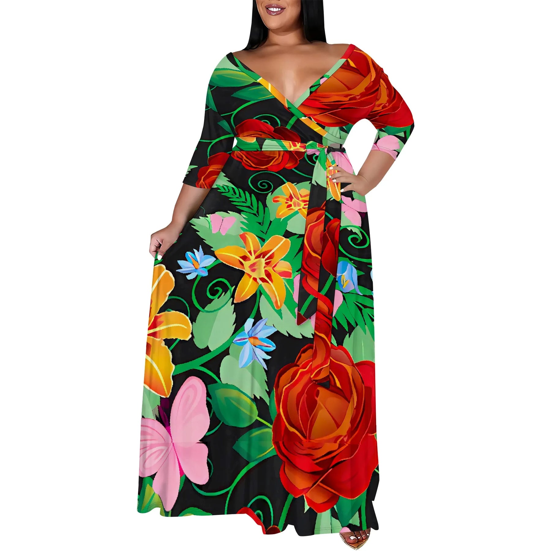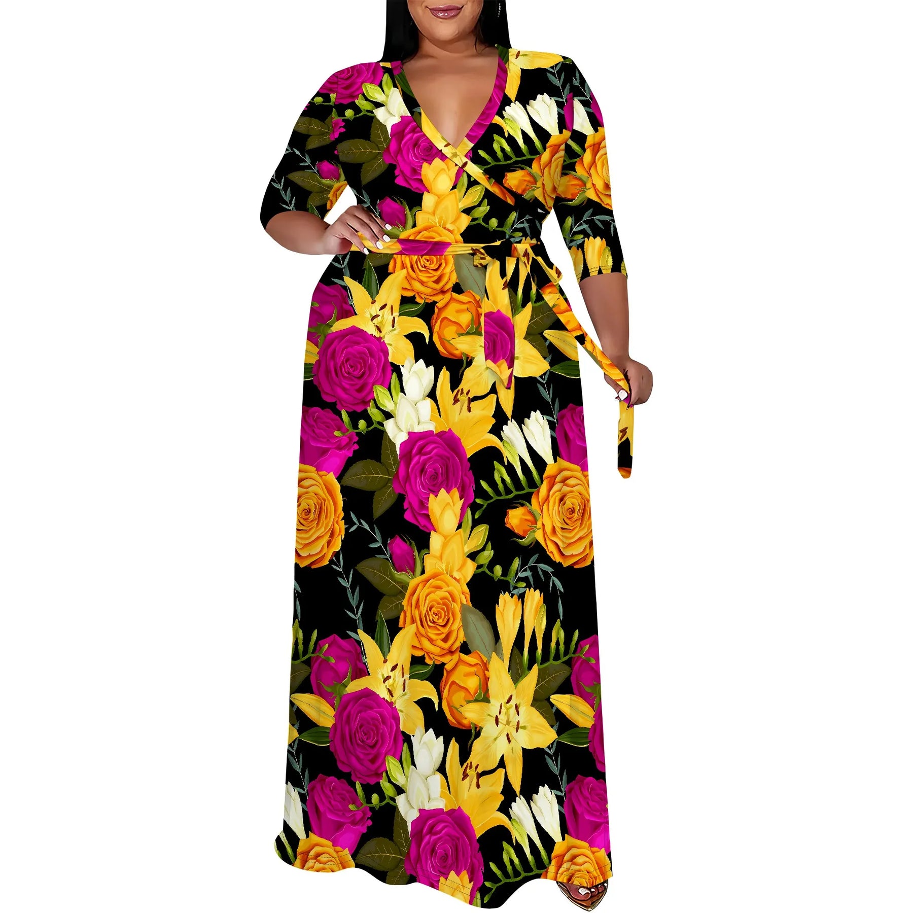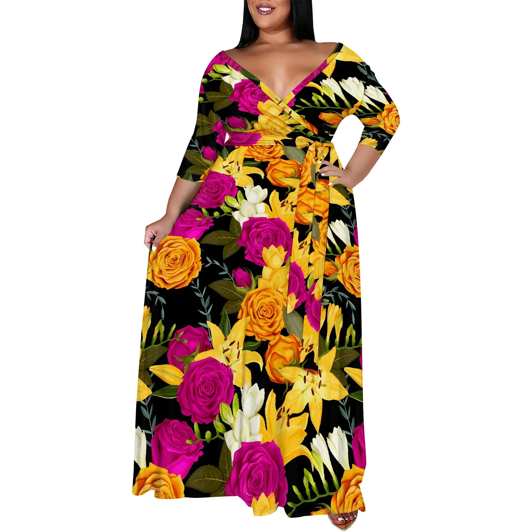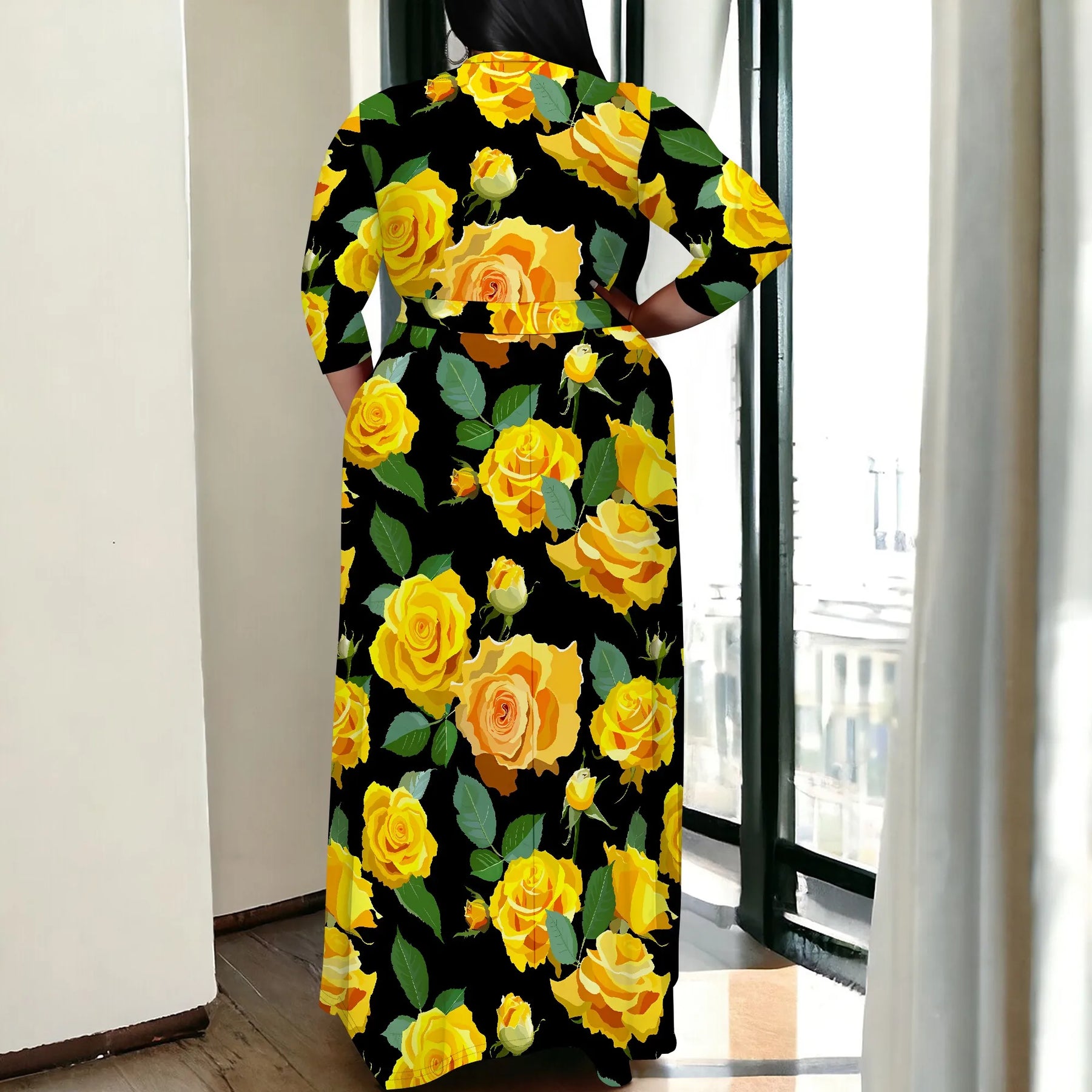 Turn every room into your runway with this stunning Plus Size Floral Maxi Dress, featuring a rich black base adorned with bold yellow rose prints. Designed with a flattering wrap V-neckline, this dress brings elegance, femininity, and effortless charm to any occasion.