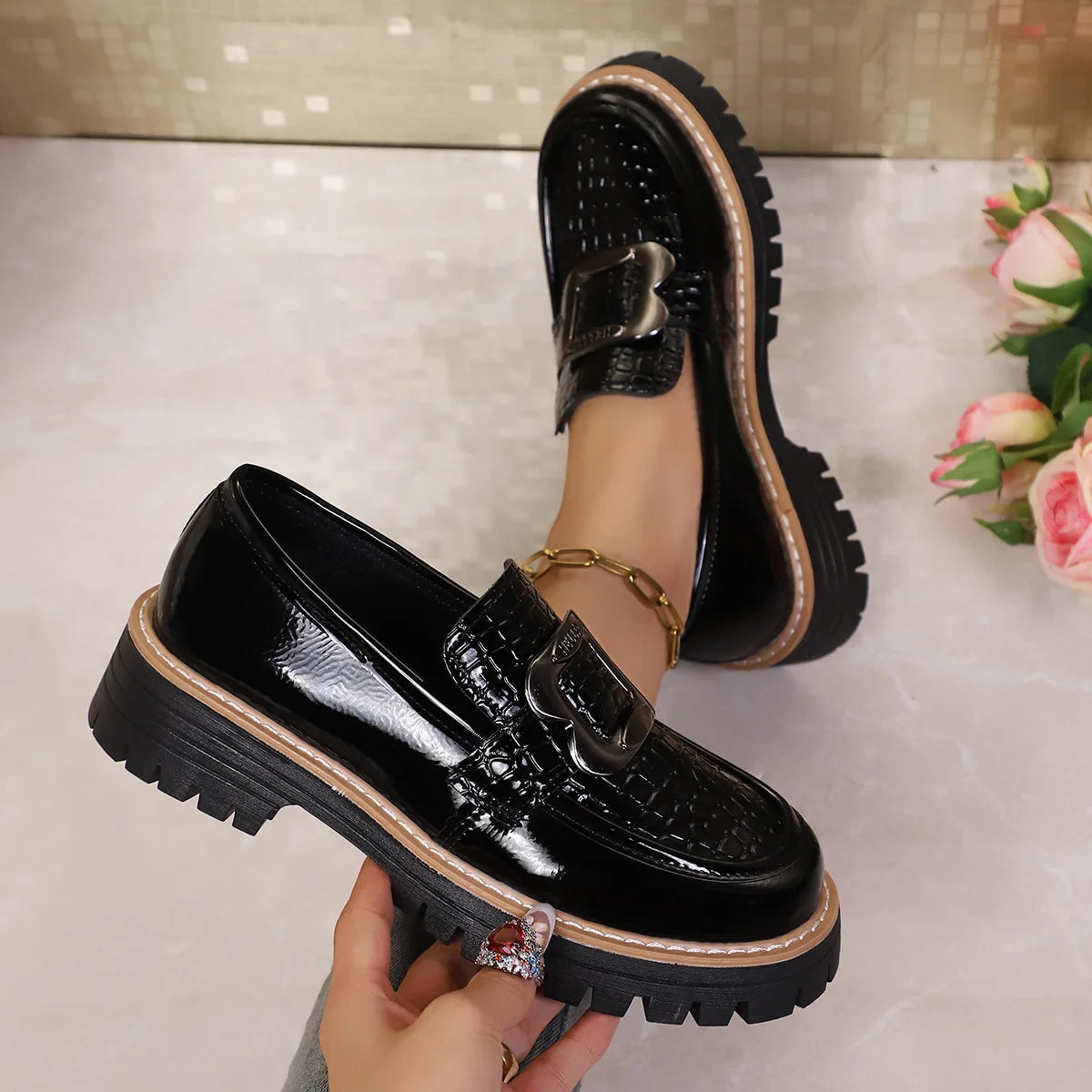 With a thick sole and mid-height heel, they provide extra height while ensuring stability and all-day comfort.